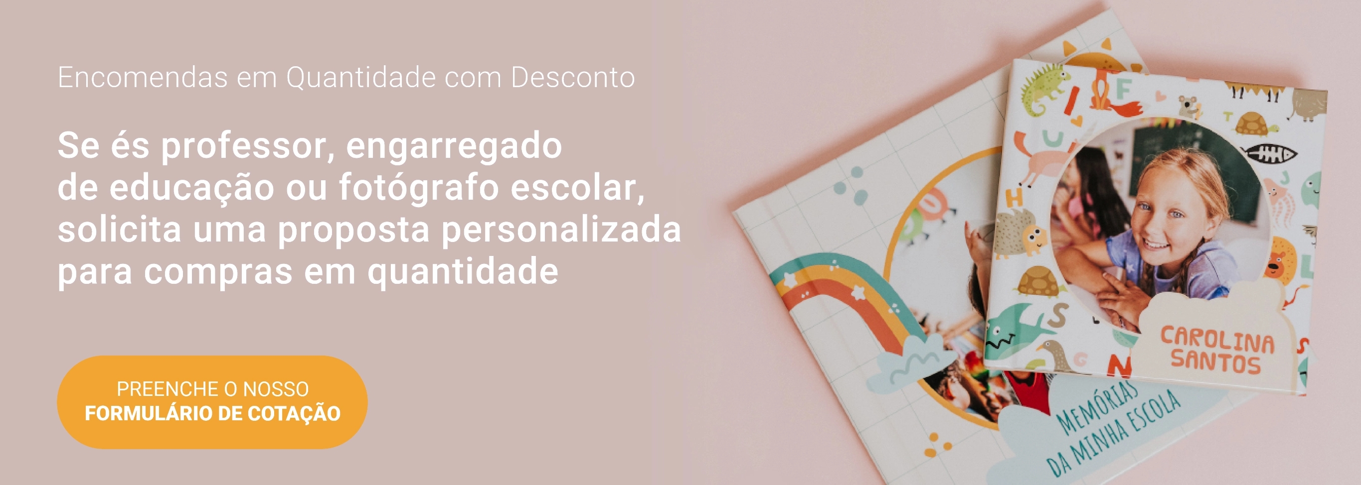 Se estás a preparar uma despedida de turma, és fotógrafo escolar ou estás a organizar a festa de finalistas, fica a saber que temos condições especiais para encomendas em quantidade. Na Dreambooks podes criar lembranças para finalistas de curso ou lembranças para finalistas do 1o ciclo. Podes fazer o pedido através do nosso formulário de cotação para grupos — ideal para escolas, professores e outras pessoas que organizam este tipo de evento.