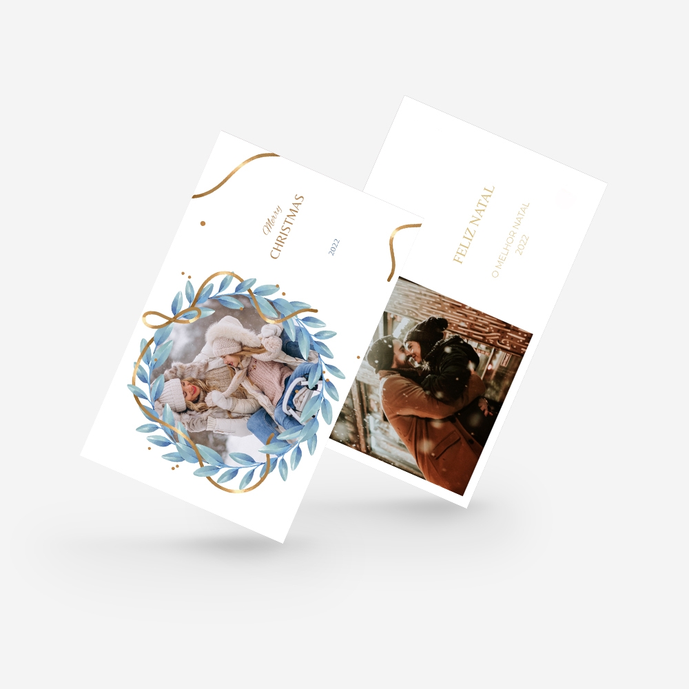 Os postais de Natal são um excelente complemento à surpresa que pretendes proporcionar aos teus familiares e amigos e para enviar às pessoas que infelizmente não podem passar o Natal em família por estarem longe, sobretudo aqueles que por razões profissionais residem noutros países. Nestes casos, os Postais assumem ainda mais significado, uma vez que conseguem levar algum conforto e amor, através das palavras e de fotografias. Podes criar o teu Postal de Natal de raíz ou escolher um dos modelos disponíveis no nosso editor online. Encontras vários temas com elementos de Natal diversificados, como a coroa natalícia, o pinheirinho, o simples ho, ho, ho e muitos mais. Podes aproveitar a tua foto favorita da sessão de natal para personalizar um postal e surpreender todos os familiares e amigos.